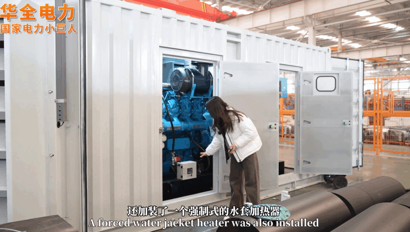 華全電力的集裝箱發(fā)電站,配備了強(qiáng)制型水套加熱器,在啟動前就給機(jī)組內(nèi)的柴油、機(jī)油、防凍液等加熱,快速達(dá)到負(fù)荷運轉(zhuǎn)要求。